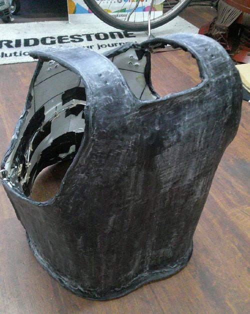 さて胴ですが、どうも布貼り、磨きでは限界があり、合皮を貼ってみることに。これも当初は上手くいかなかったのです、二枚目で、極力いずらないようにしてみた所、綺麗な仕上がりに。
