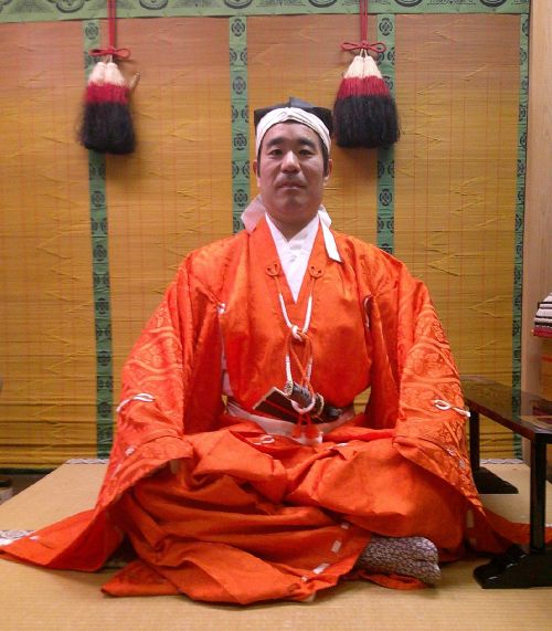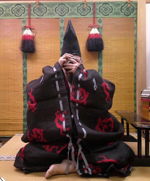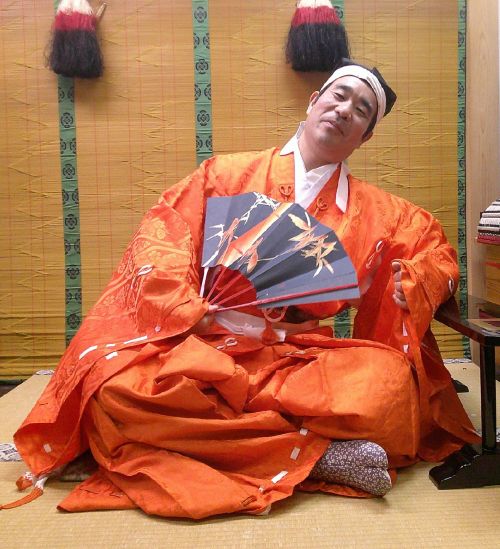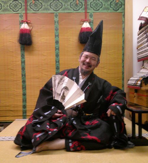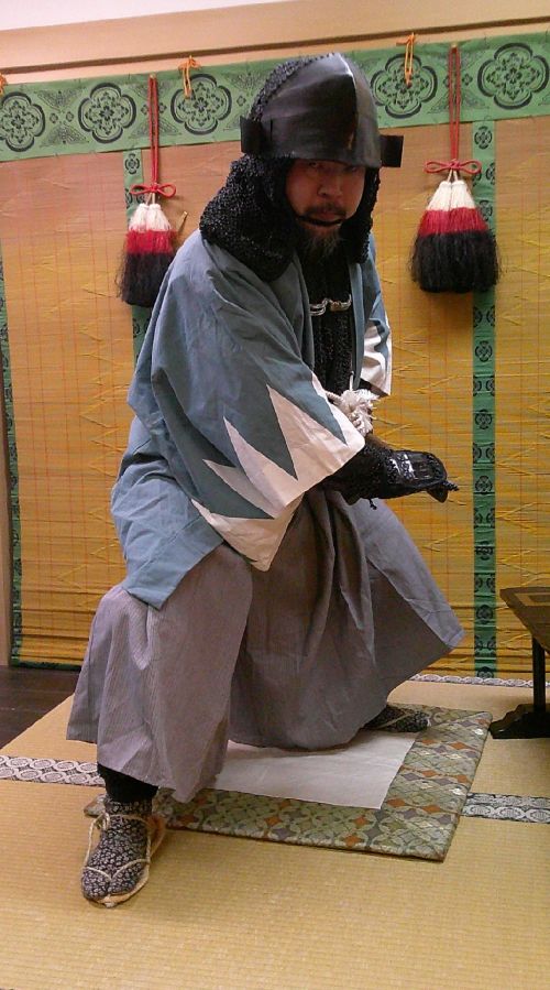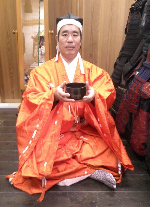 撮影後、直垂に着替えて、正臣さんにお茶と義士祭りで買った切腹最中を振る舞いました。